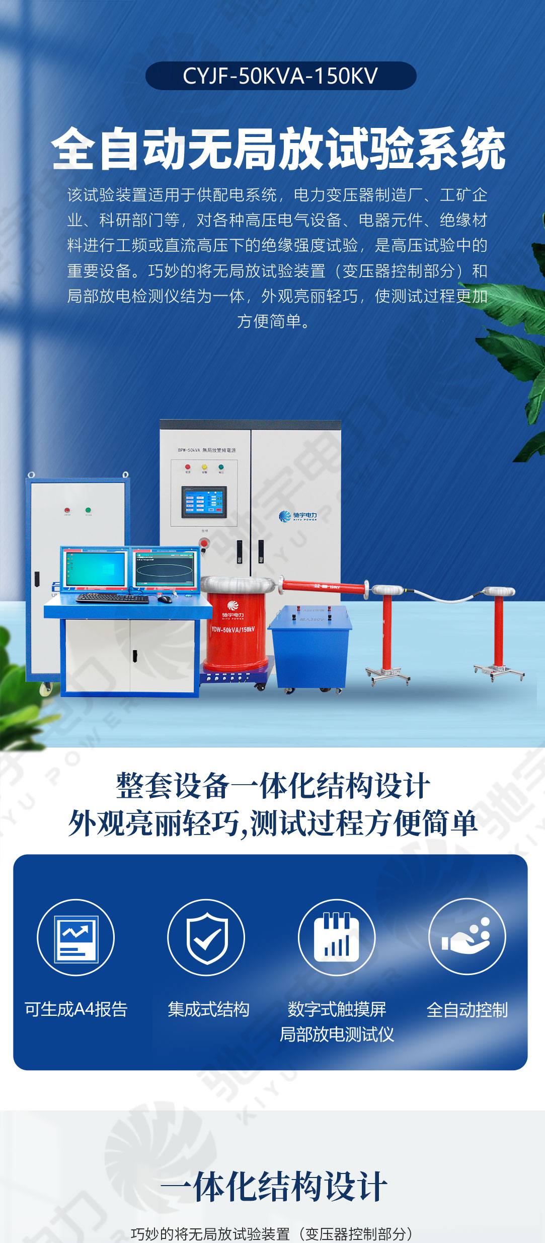 无局放试验系统 CYJF-50kVA/150kV,适用于供配电系统,电力变压器制造厂、工矿企业、科研部门等,对各种高压电气设备、电器元件、绝缘材料进行工频或直流高压下的绝缘强度试验,是高压试验中常用的重要设备。巧妙的将无局放试验装置(变压器控制部分)和局部放电检测仪结为一体,外观亮丽轻巧,使测试过程更加方便简单。
